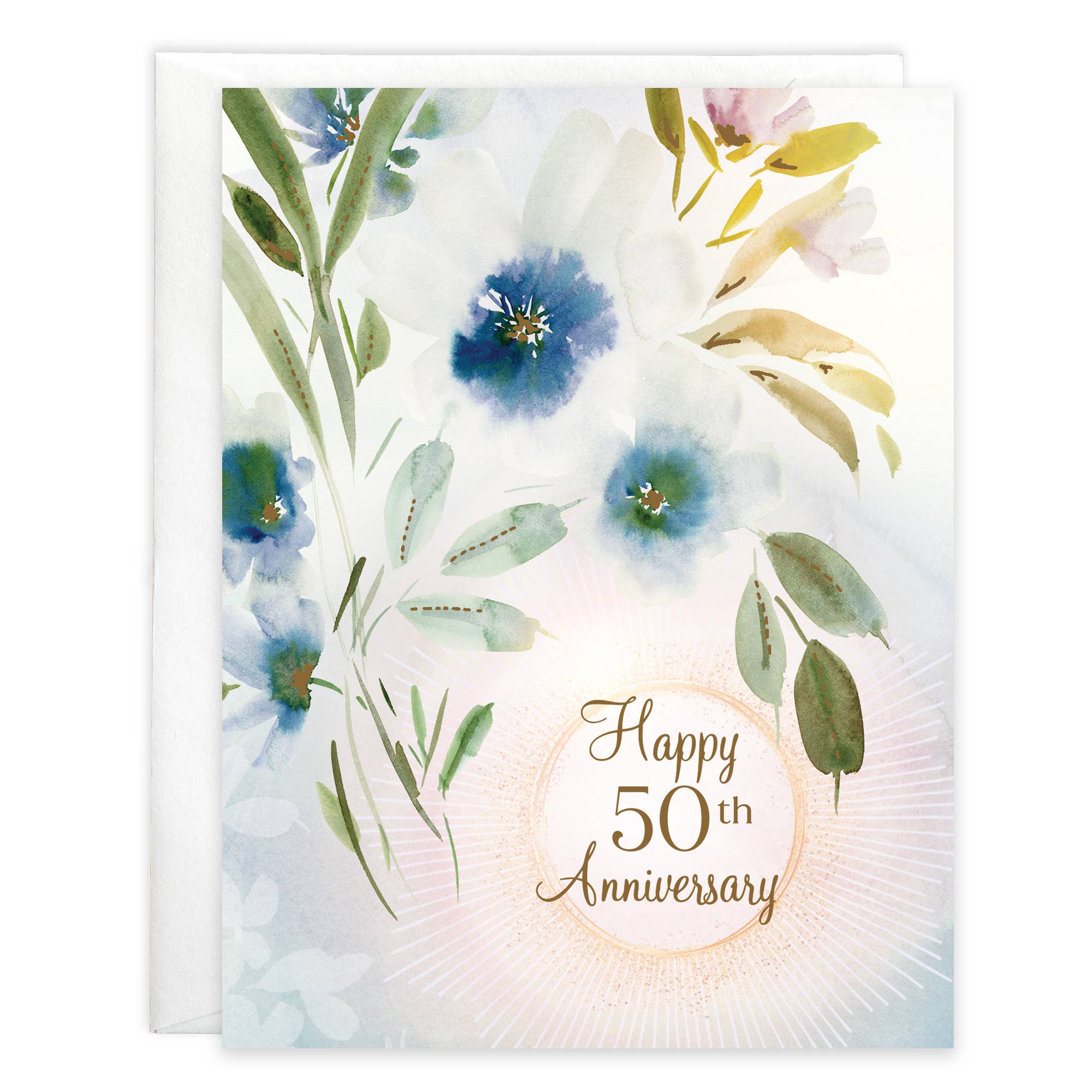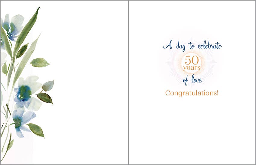 Greeting card with envelope Happy 50th Anniversary A day to celebrate 50 years of love Congratulations! Embellished with gold foil Folded size: 4.25" x 5.5" (A2) Proudly made in the USA