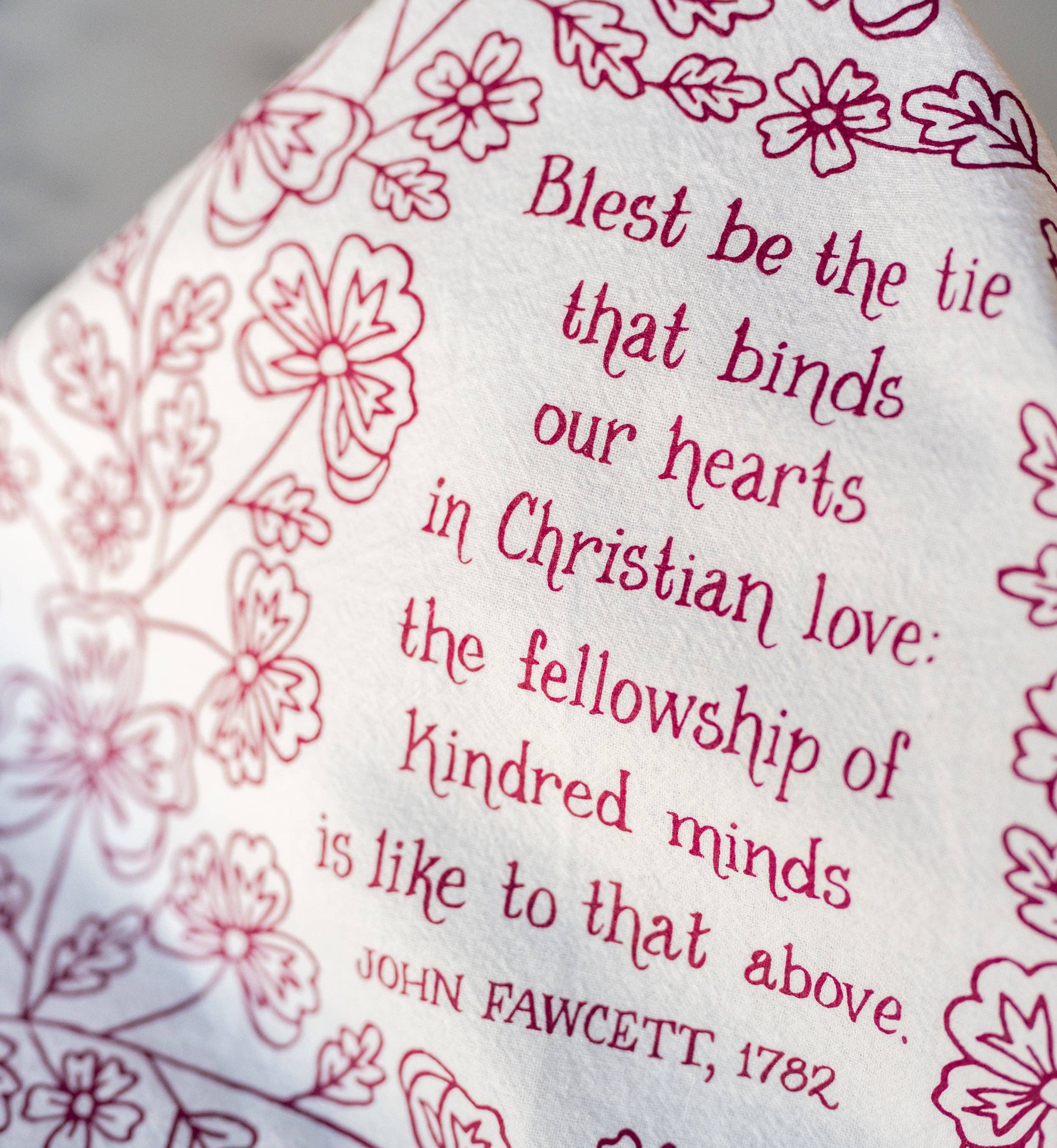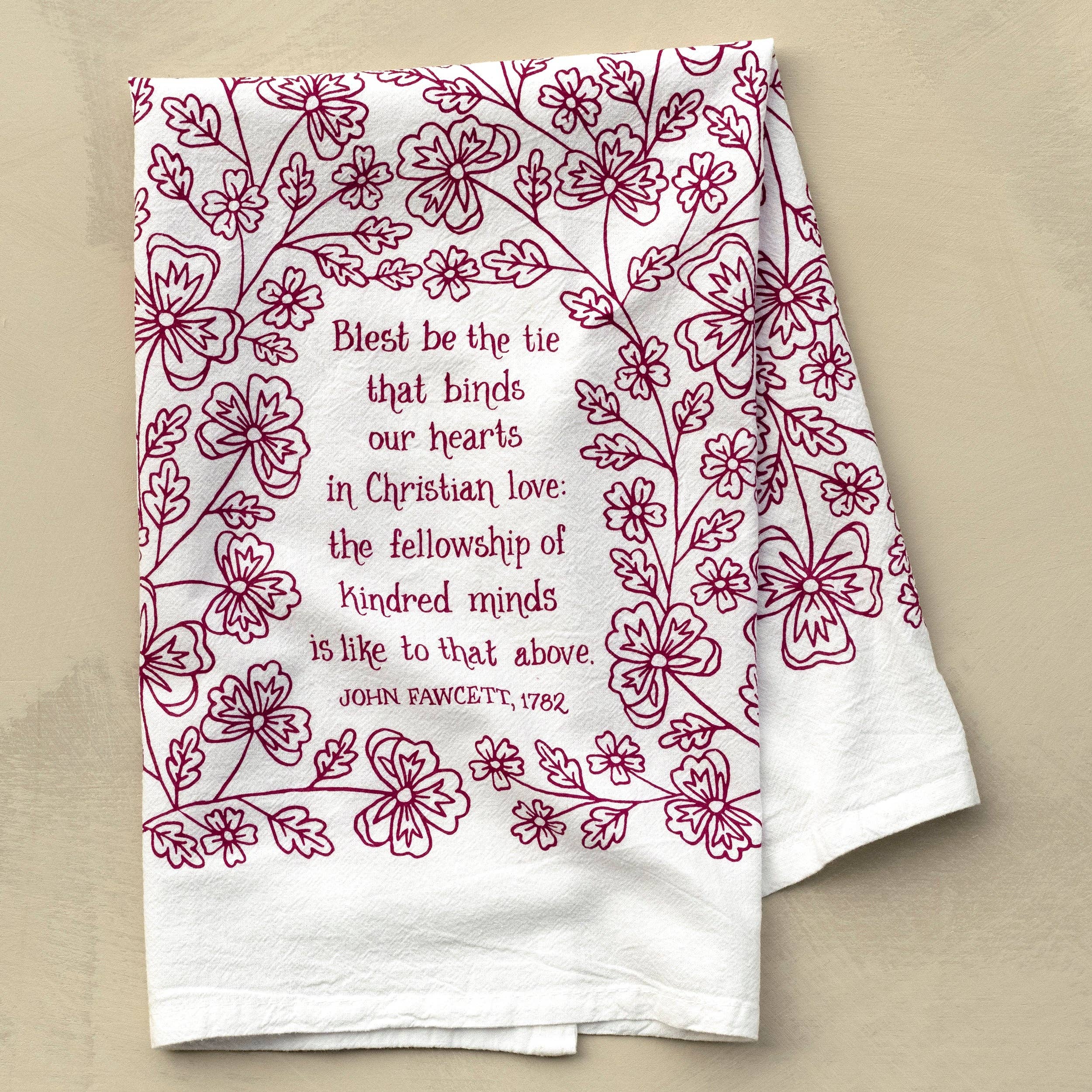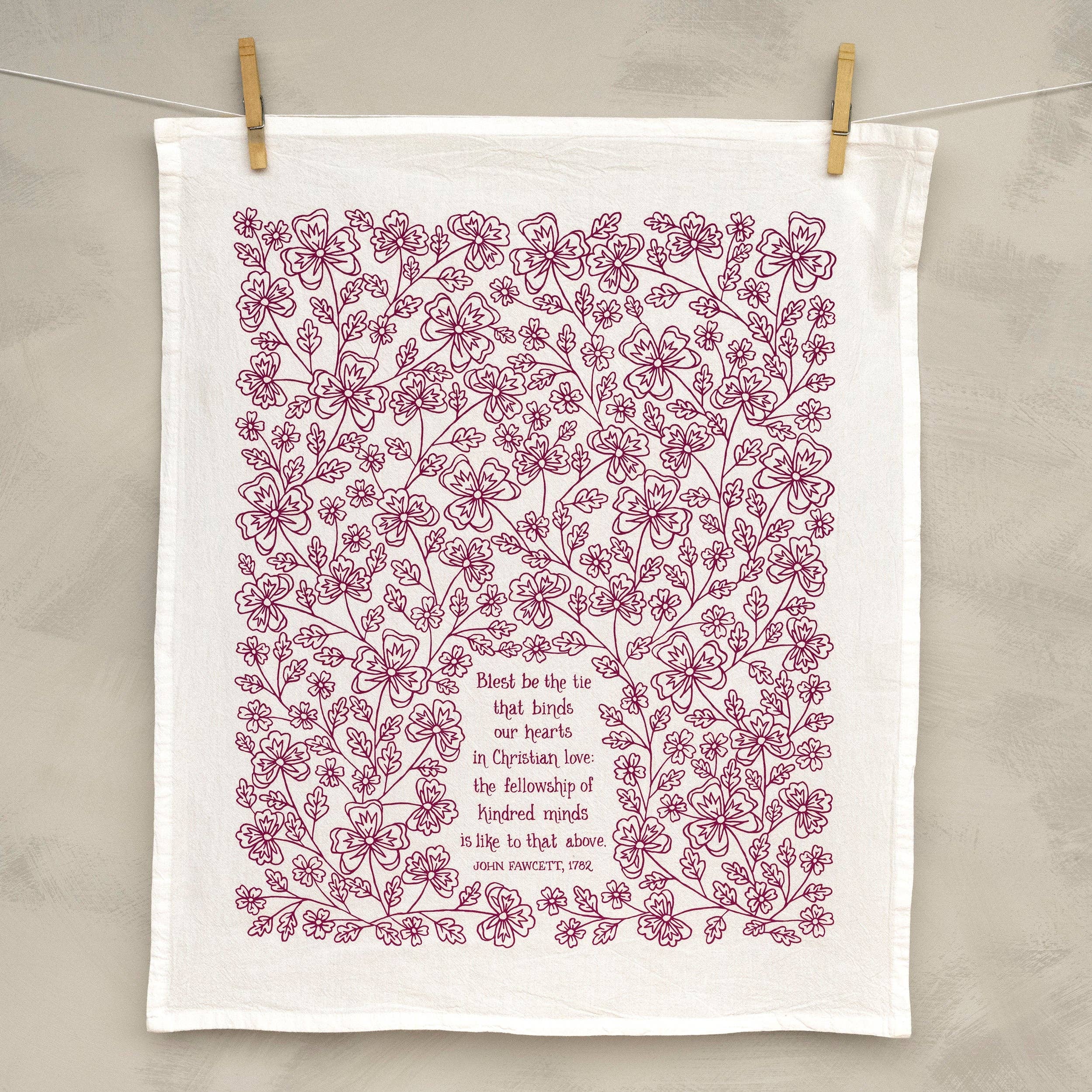 Our hymn tea towels brighten your home with color and song. The Blest Be the Tie That Binds hymn tea towel is printed in midnight magenta and features lyrics from the hymn accented by intricate floral illustrations. Made of 100% cotton, these flour sack tea towels easily and cost-effectively replace disposable paper towels with high absorbency and durability. Generously sized, lint free, and made to last a lifetime. Illustrated by Kate Whitley. * 24″L x 20″W * Folded and wrapped with a matching belly band * Machine-washable, 100% cotton * Screen printed in Mt. Juliet, Tennessee * Made in USA