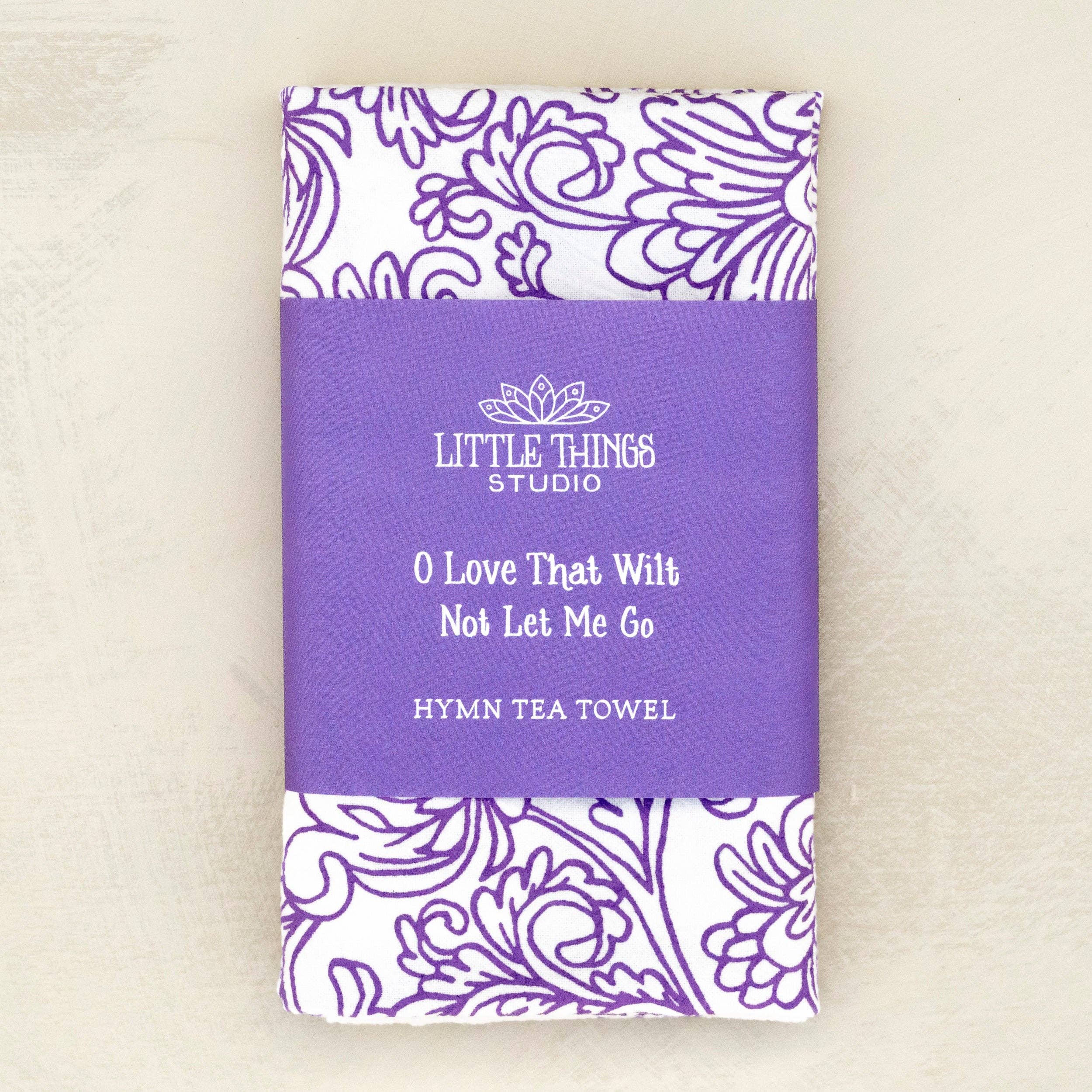 Our hymn tea towels brighten your home with color and song. The O Love That Wilt Not Let Me Go hymn tea towel is printed in lavender accented by intricate floral illustrations. Made of 100% cotton, these flour sack tea towels easily and cost-effectively replace disposable paper towels with high absorbency and durability. Generously sized, lint free, and made to last a lifetime. Illustrated by Kate Whitley. * 24″L x 20″W * Folded and wrapped with a matching belly band * Machine-washable, 100% cotton * Screen printed in Mt. Juliet, Tennessee * Made in USA