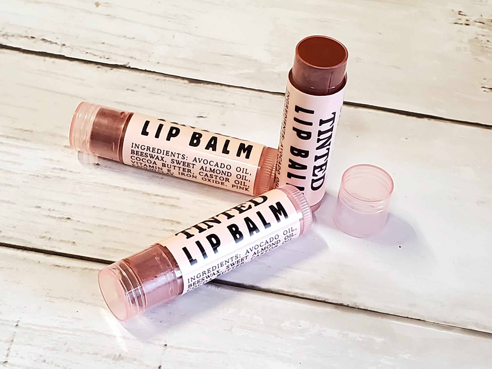 Our Tinted Lip Balm is made only with natural ingredients, just like our regular lip balms. This super emollient balm goes on smooth and leaves your lips with a luxurious, glowing sensation. Made with beeswax, sweet almond oil, castor oil, cocoa butter, vit. E, red oxide powder and beetroot powder. It imparts a natural pink tint to the lips; since we don't add any flavors to this balm, it may also be used as a natural rouge on the cheeks.