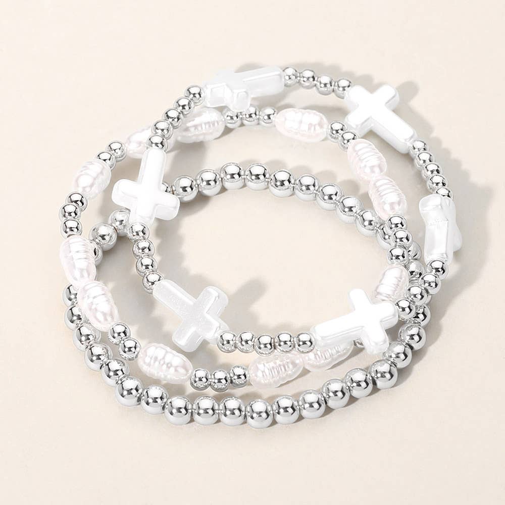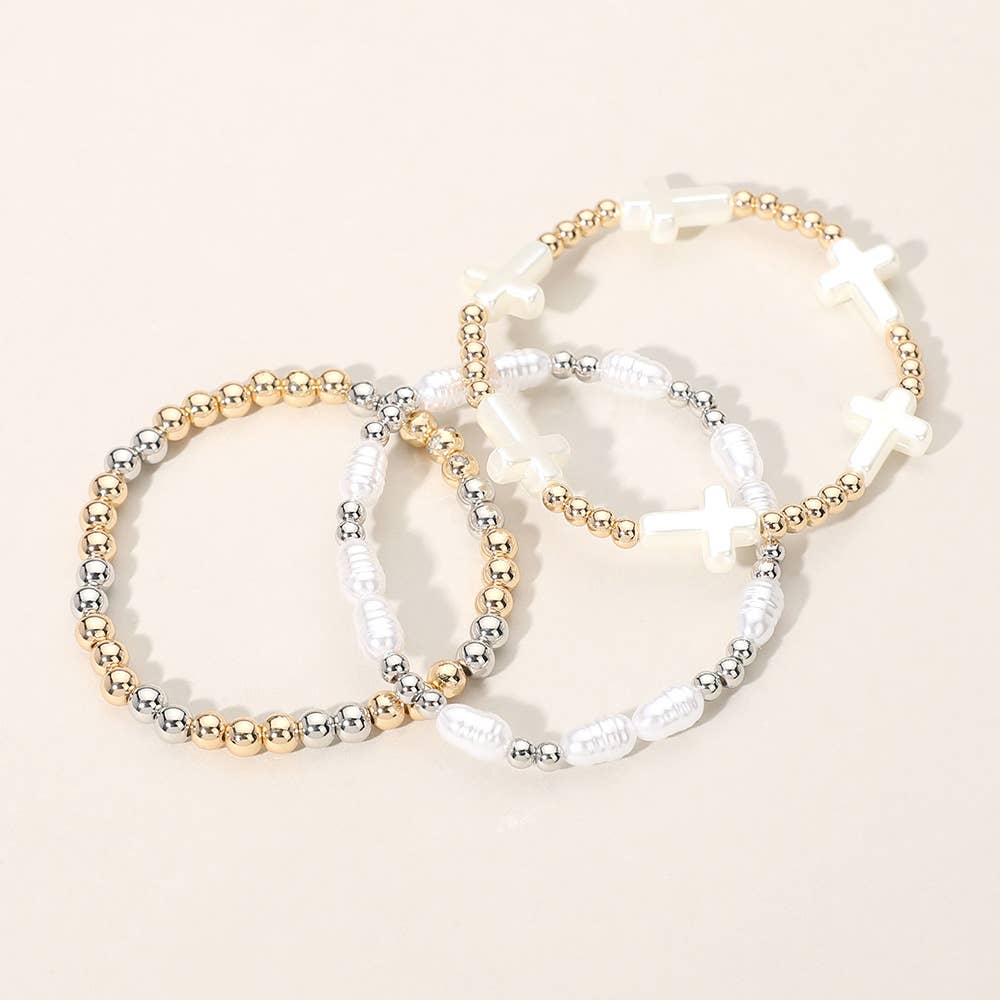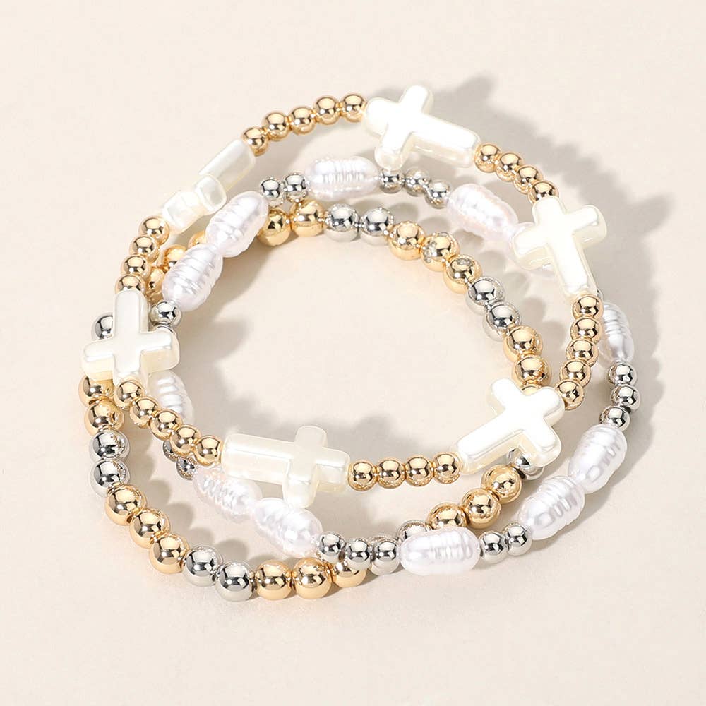 3PCS - Pearl Cross Metal Ball Beaded Stretch Multi Layered Bracelets