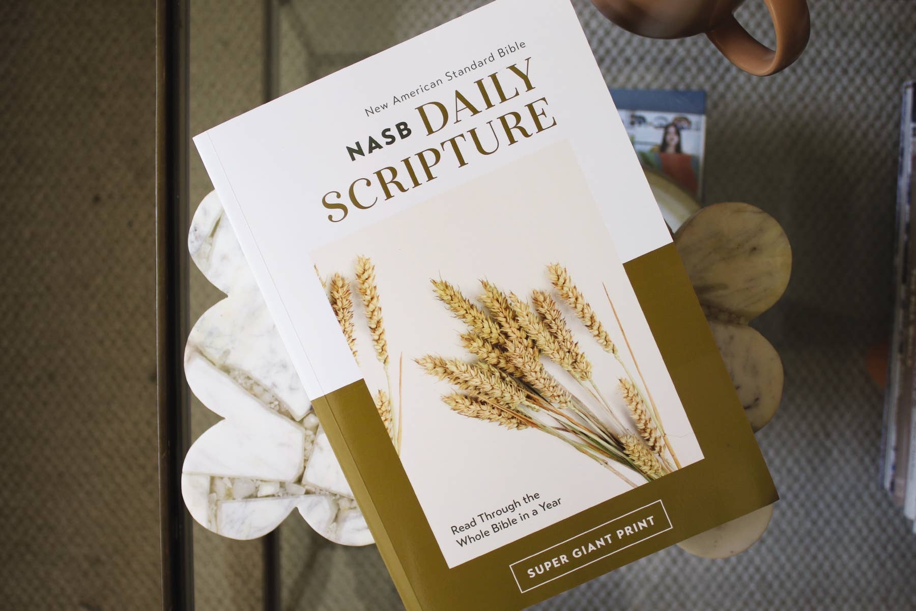 • Softcover • 1-Color Black • The NASB Daily Scripture, Super Giant Print, pairs a 365-day reading arrangement with a super giant print type size. Each day’s reading includes a short meditation with a Scripture portion from the Old Testament, New Testament, and a Psalm or Proverb, allowing you to read through the whole Bible in a year by setting aside just 15 minutes per day.