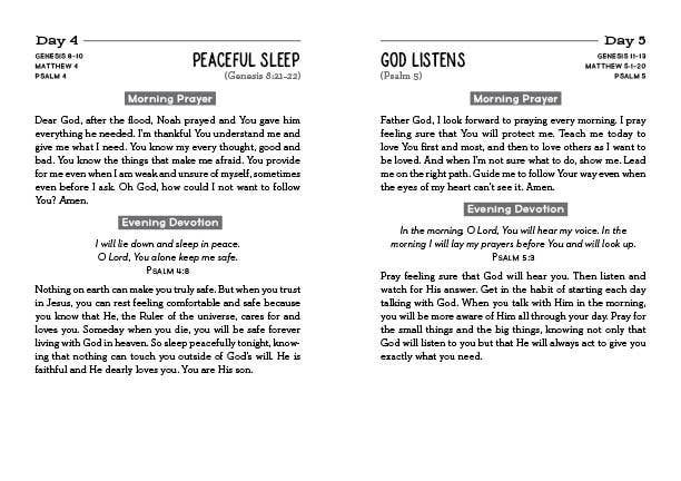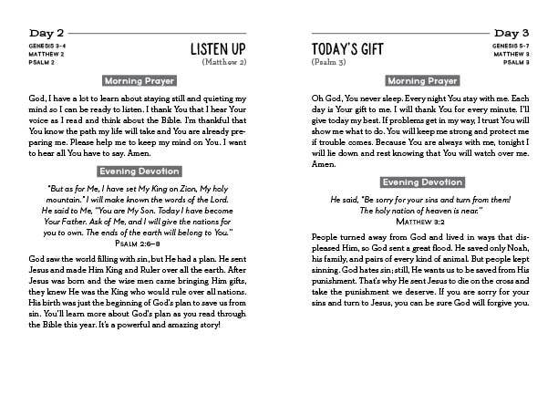 The All-in-One Devotional Experience for Boys! This cool devotional, created especially for you, includes a simple plan for reading and praying through the Bible in one year alongside both 3-minute devotions and prayers for morning and evening. Each day of the year, you’ll be invited to read a passage from the Old Testament the New Testament and the Psalms or Proverbs along with a thoughtful devotional and a heartfelt prayer starter. With each turn of the page, you’ll discover practical truth for everyday living. It’s a perfect way to spend a year in God’s Word!
