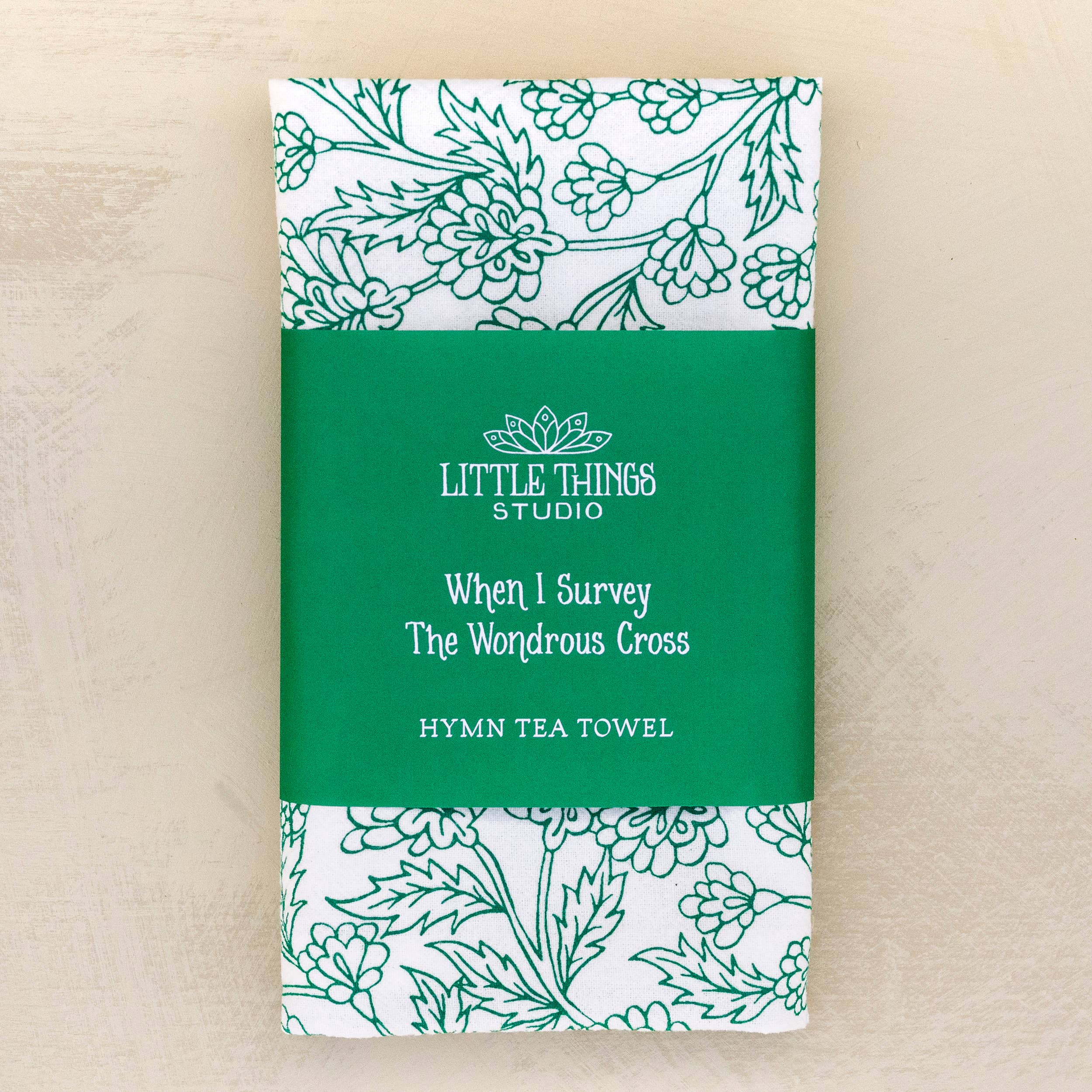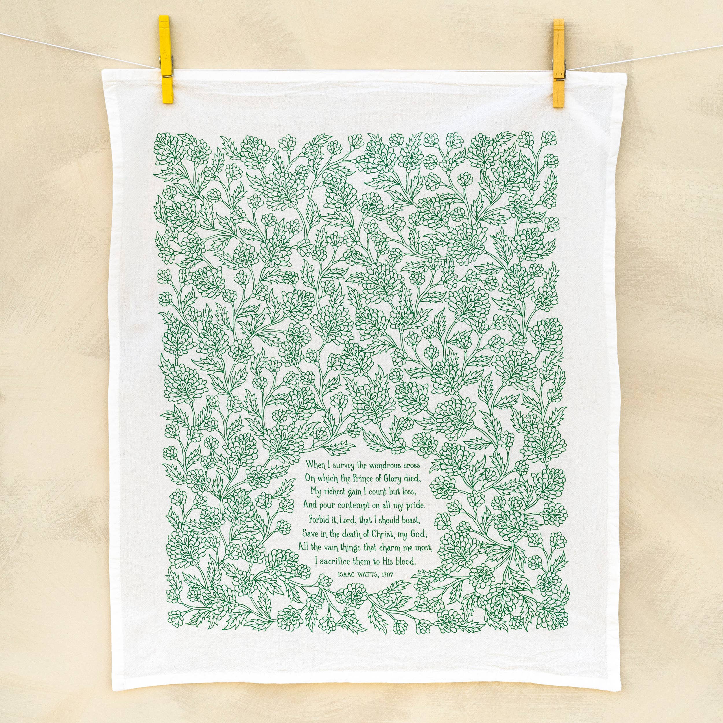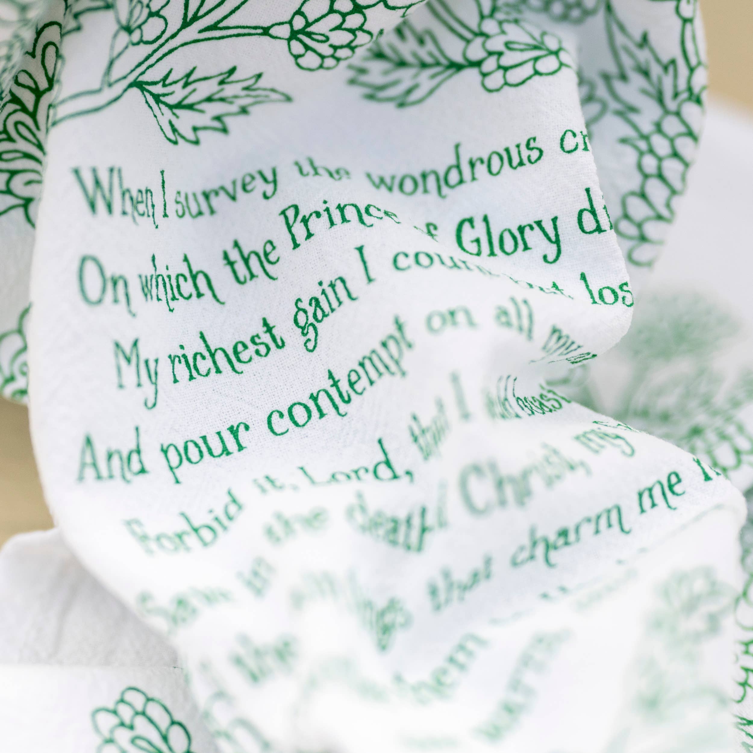 Our hymn tea towels brighten your home with color and song. The "When I Survey the Wondrous Cross" tea towel is printed in emerald green and features lyrics from the hymn accented by intricate floral illustrations. Made of 100% cotton, these flour sack tea towels easily and cost-effectively replace disposable paper towels with high absorbency and durability. Generously sized, lint free, and made to last a lifetime. Illustrated by Kate Whitley. • 24″L x 20″W • Folded and wrapped with a matching belly band • Machine-washable, 100% cotton • Screen printed in Mt. Juliet, Tennessee • Made in USA