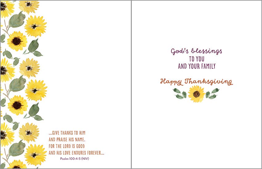 With Scripture Thanksgiving Greeting Greeting Card - Sunflower Wreath Greeting card with envelope. Thankful Grateful Blessed God's Blessings to you and your family (Psalm 100:4-5 NIV) Embellished with foil. Folded size 4.25" x 5.5" Proudly made in the USA Folded size: 4.25" x 5.5". Proudly made in the USA.