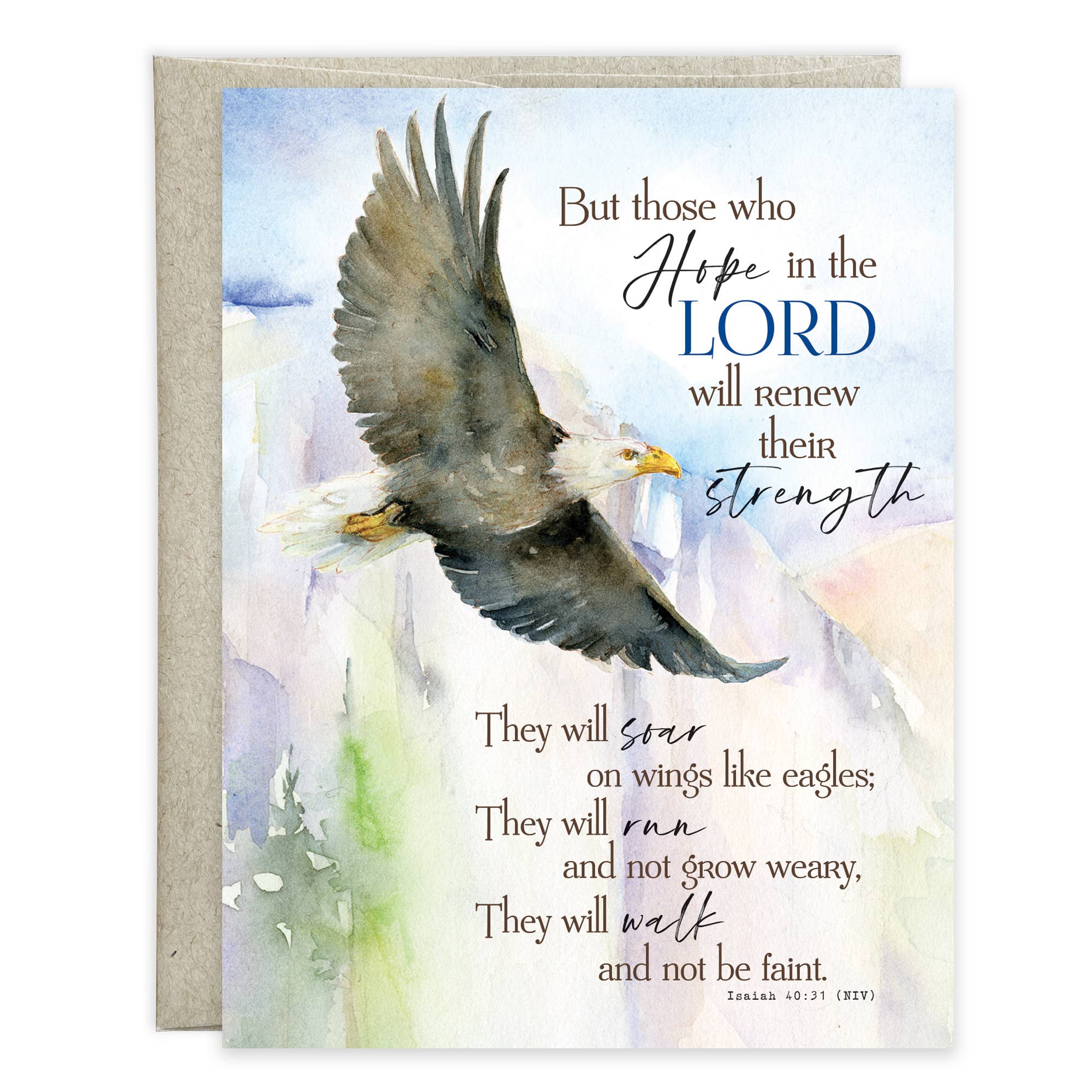 Greeting card with envelope. (Isaiah 40:31 NIV) Thinking of you Folded size: 4.25 x 5.5". Art by John Keeling Paintings Made in the USA.