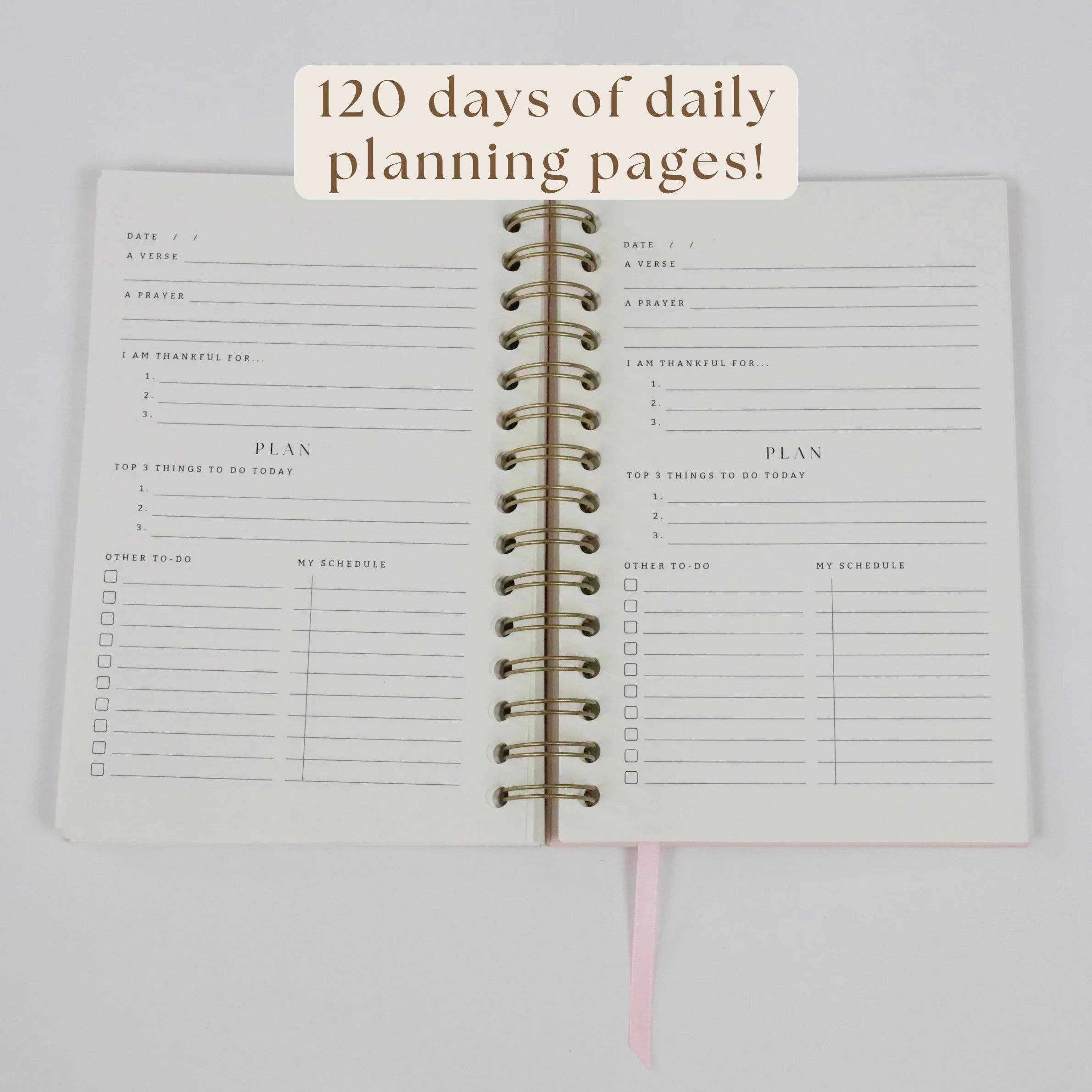 Introducing the Daily Faith-Based Planner Journal! A place to: > Center your day around God with a verse & prayer > Start with a positive attitude with 3 things you’re thankful for > Plan according to importance to make sure you complete what you need to! Start with your top 3 priorities, and list other things to-do & time-block your schedule or appointments. What’s included: > 120 days of daily planning pages! About 4 months total, about 5 months excluding weekends! Plus 6 months of: > Calendar overview planning > Prayer requests & praise reports lists to look back on > Monthly goals & steps to achieve them > Bonus: 6 more pages of blank lines! For extra to-do items, prayers, additional planning, etc. Note from the founder: As a busy business owner (and initially college student at the same time), sister, and friend I get it- life can feel crazy! So I thought through what helps me balance my day so I can be present in the moments that matter while being able to accomplish what I need to, and created an a