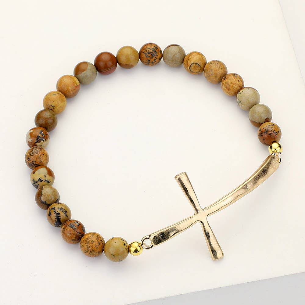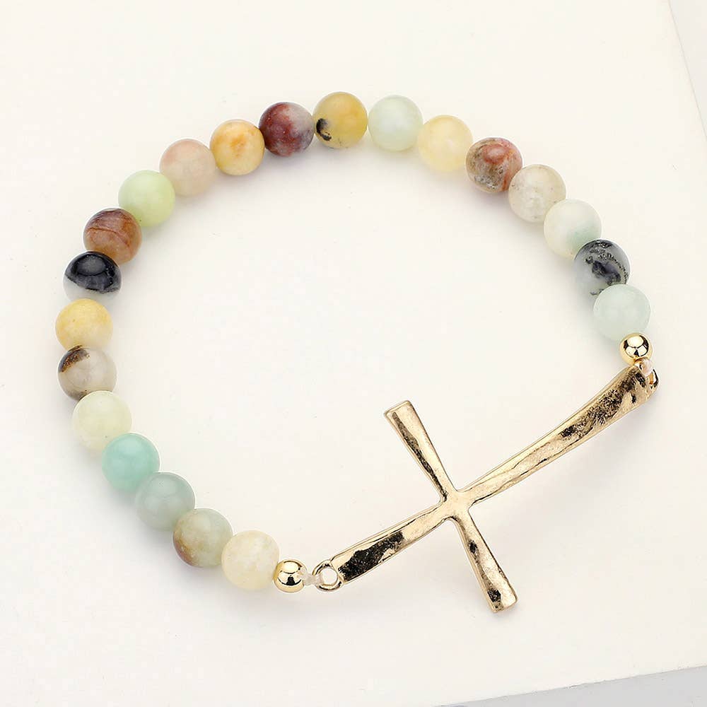 Hammered Metal Cross Semi Precious Natural Stone Beaded Stretch Bracelet