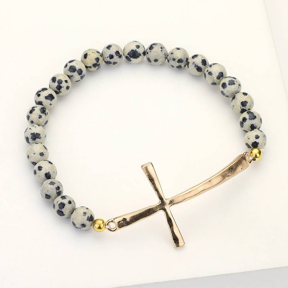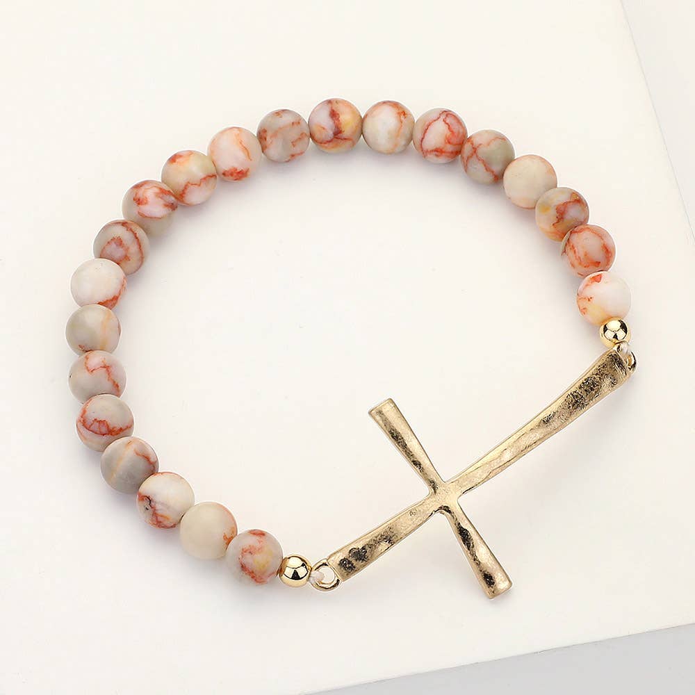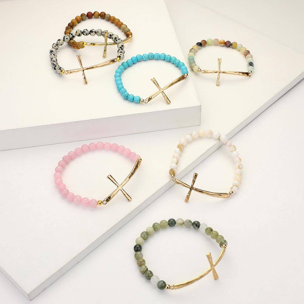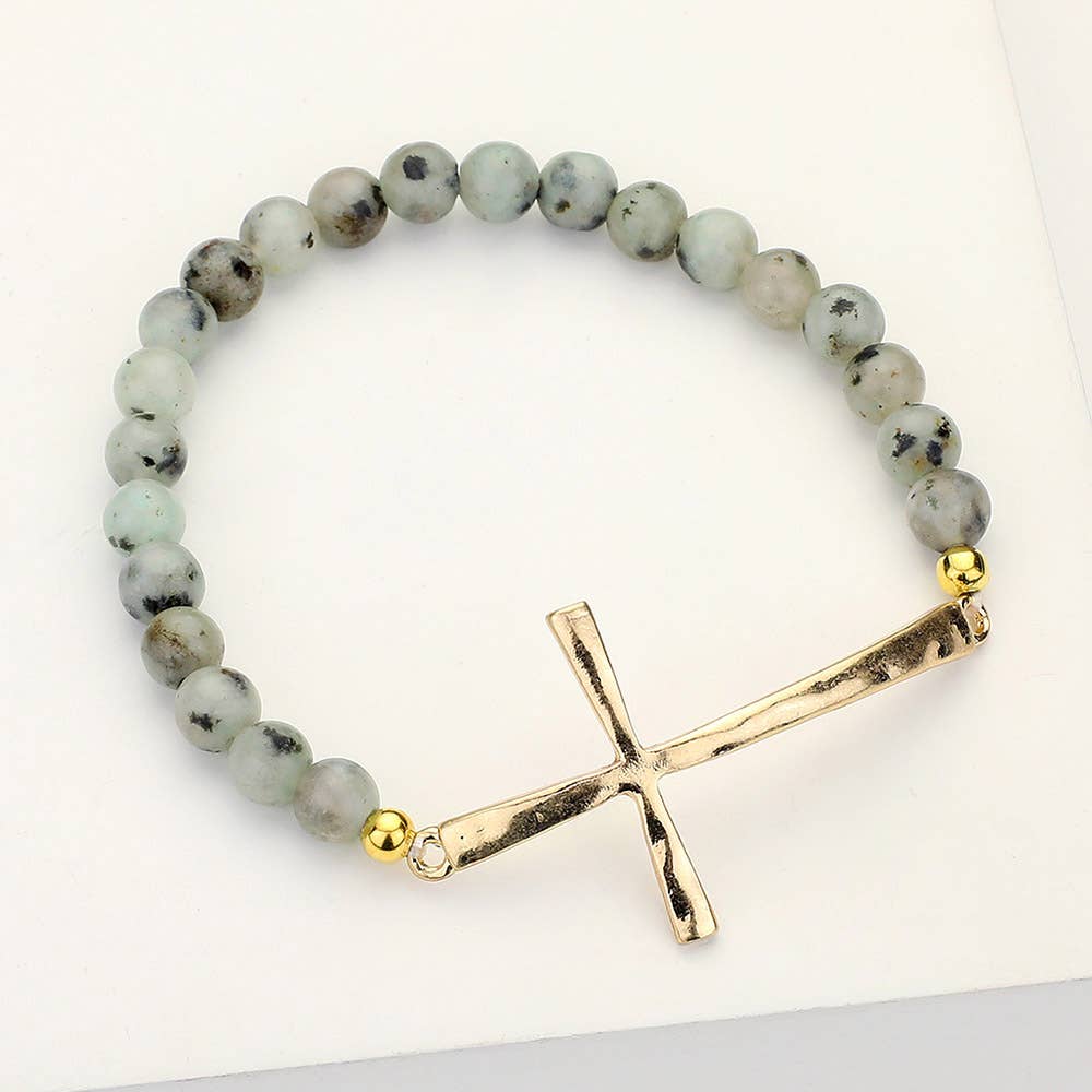 Hammered Metal Cross Semi Precious Natural Stone Bracelet